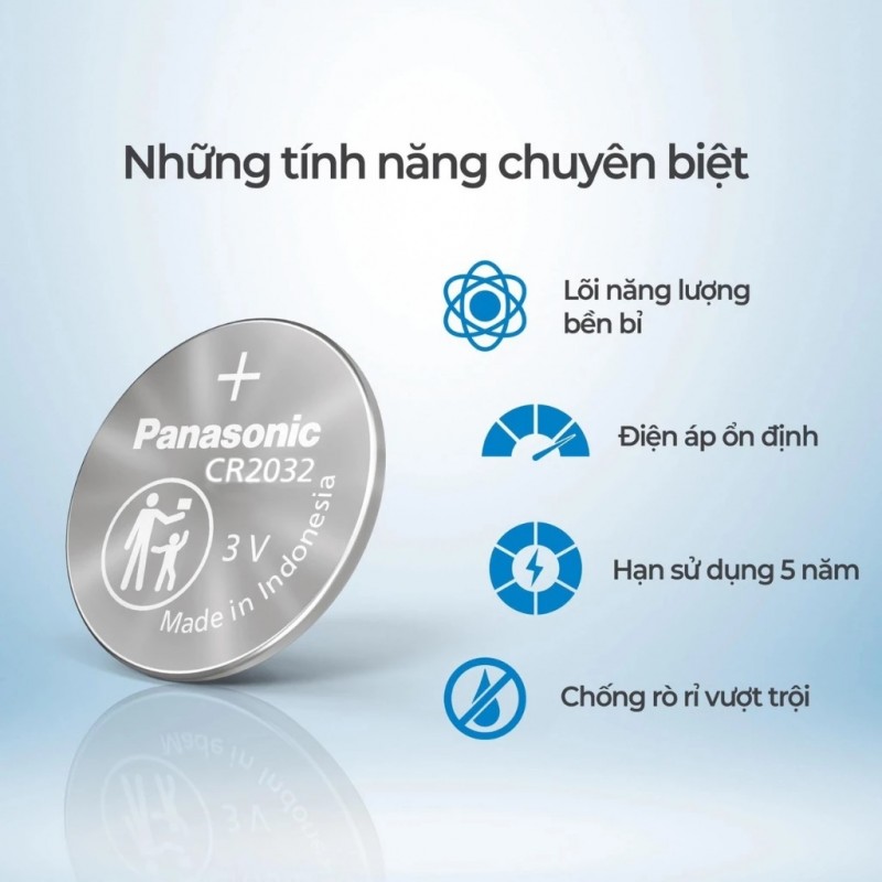 Pin Khuy Cúc Áo Panasonic CR2032 3V Lithium GIÁ BÁN TÍNH THEO TỪNG VIÊN!!! Pin khuy áo / cúc áo Panasonic với rất nhiều kích thước, phù hợp cho các loại remote xe hơi, xe máy có remote smartkey honda Airblade, SH, Vario, Lead,... các loại đồng hồ đeo tay hay đèn pin siêu nhỏ,... cmos laptop,.. Ngoài ra loại pin này còn được sử dụng phổ biến cho remote keyless, nút điều khiển bộ start/stop engine.... Pin Panasonic CR2032 - Kích thước: 20 * 3,2mm TÍNH NĂNG NỔI BẬT: - Điện áp: 3V - ..