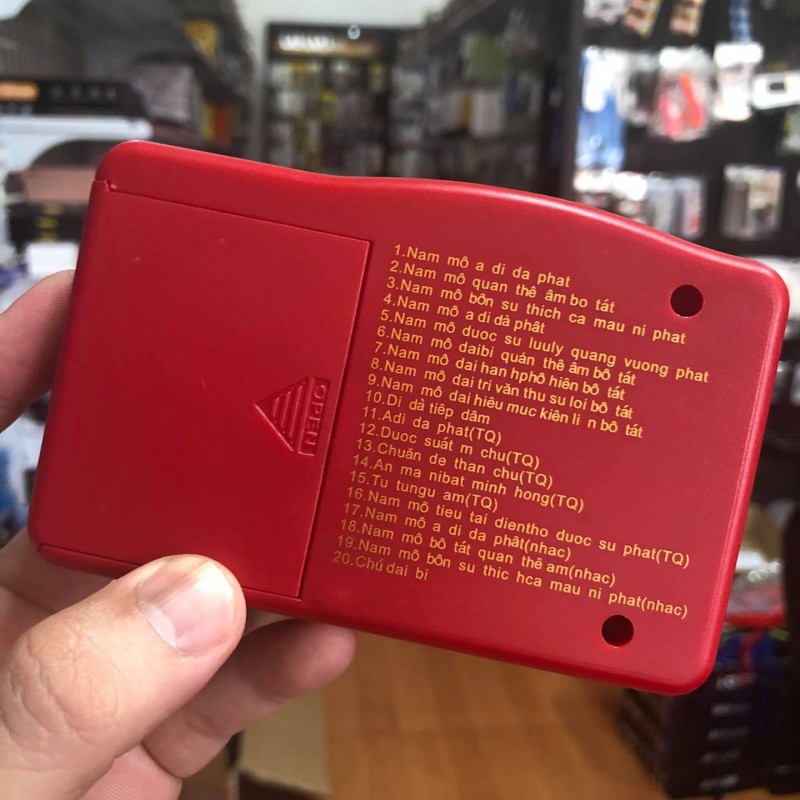 Máy niệm phật A di đà thiết kế nhỏ gọn, có thể sử dụng 2 viên pin 2A có thể mang đi bất kỳ nơi đâu để nghe niệm câu A Di Đà Phật.